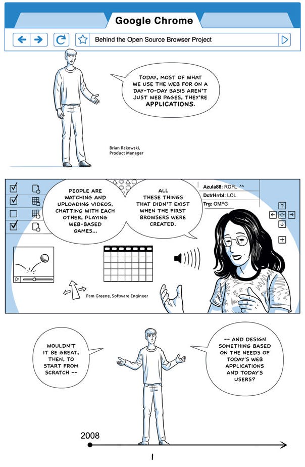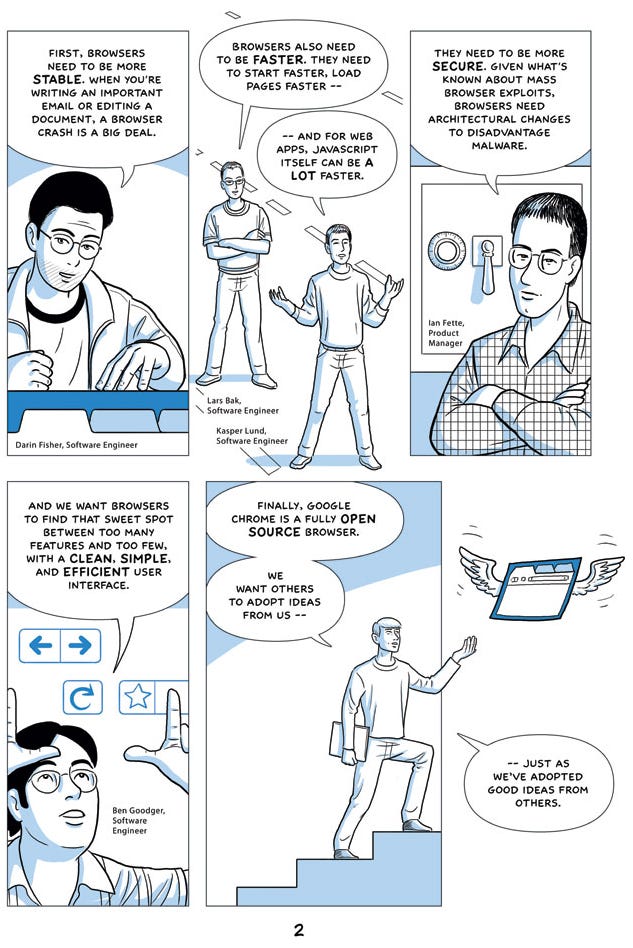 Blog yazısı, Chrome’un geliştirilmesi ile ilgili dinamiklerini pek de alışık olmadığımız bir şekilde anlatan bir çizgi romanı linkleyerek bitiyordu. Sizinle bu çizgi romanın ilk iki sayfasını paylaşmak istiyorum.