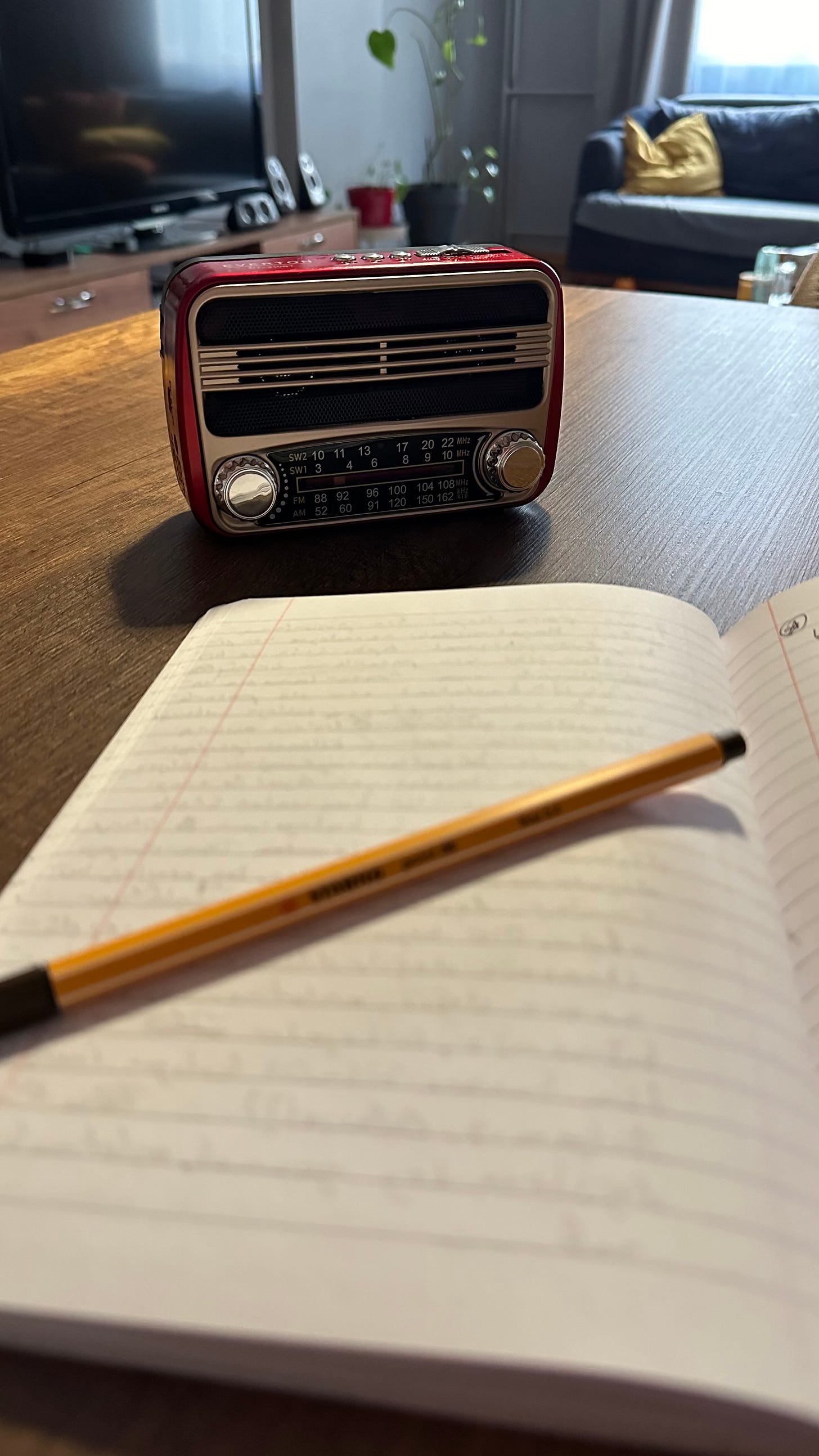 Sanırım yazı yazmak için sahip olunacak en basit setup’a sahibim. Defter ve kalem. Her yerde yazabiliyorum. Bir de FM radyo aldım arkada fonda çalsın diye. Radyo-3, Radyo Eksen arasında gelip gidiyorum. Yazmak için daha verimli bir setup’ım asla olmadı. Sade, kolay, basit.