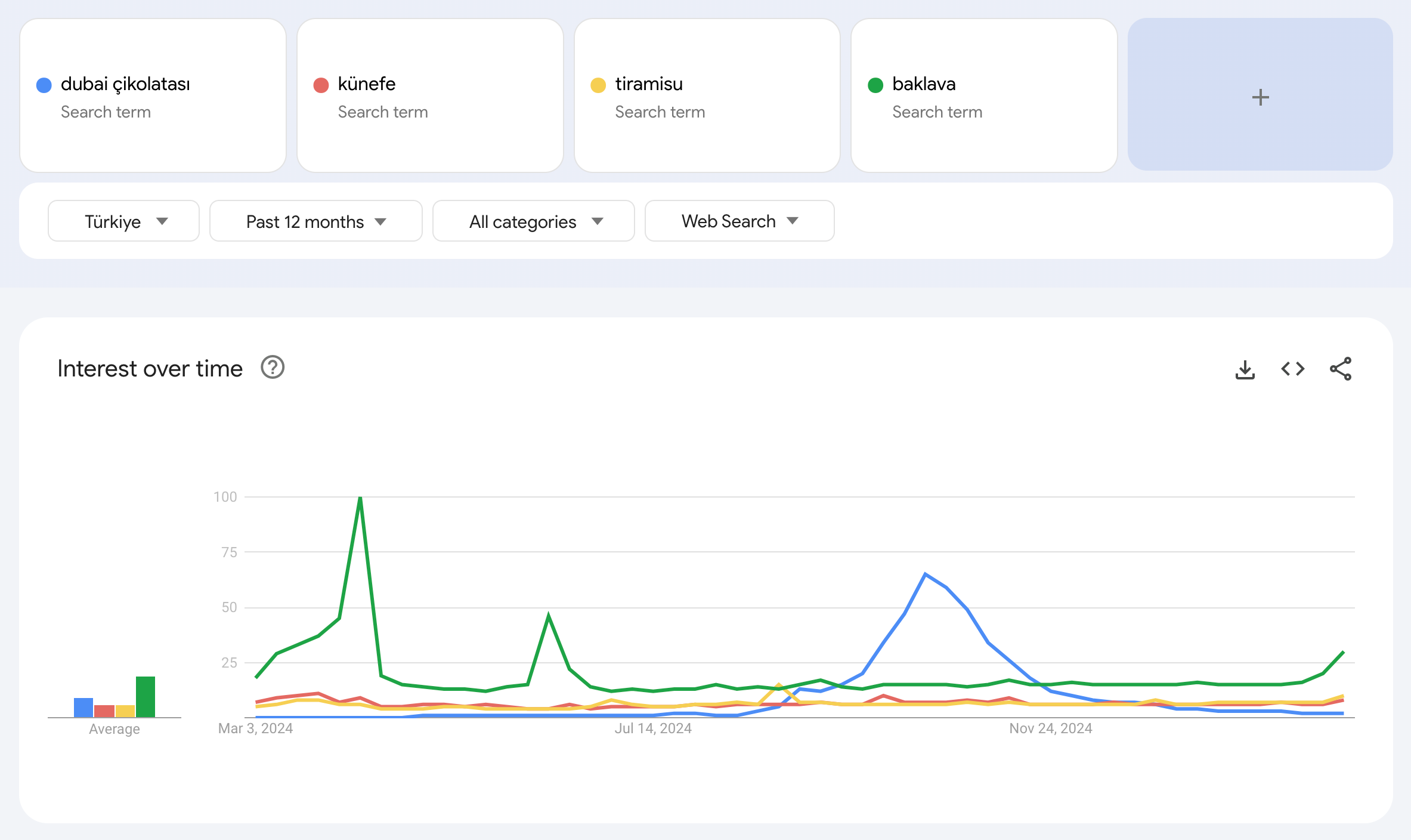 Baklava harika bir örnek. 5 yıllık grafiğe bakın. Her Ramazan ve Kurban Bayramı aramalar zirve yapmış. Bu zirveler harici tüm tatlılardan daha fazla aranmış. Neden?