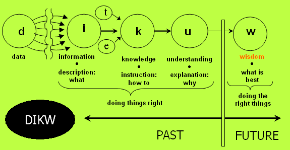 DIKW piramidinin bir diğer gösterimi veriye, geçmiş gelecek ekseninde zamansal bir zeminde yaklaşır. Datanın ilk basamakta information haline gelerek “ne?” sorusunun cevabını verdiği, sonra dönüşerek nasıl ve neden sorularına cevap verdiği bir gösterim. Bence bu gösterim şekli, what, how to ve why sorularını kullanarak modeli basitleştirmiş, uygulanabilirliğini arttırmıştır. Yine bu gösterim şekli, az önce de bahsettiğimiz, bir şeyleri doğru yapmak ile doğru şeyleri yapmak farkına vurgu yapmaktadır.