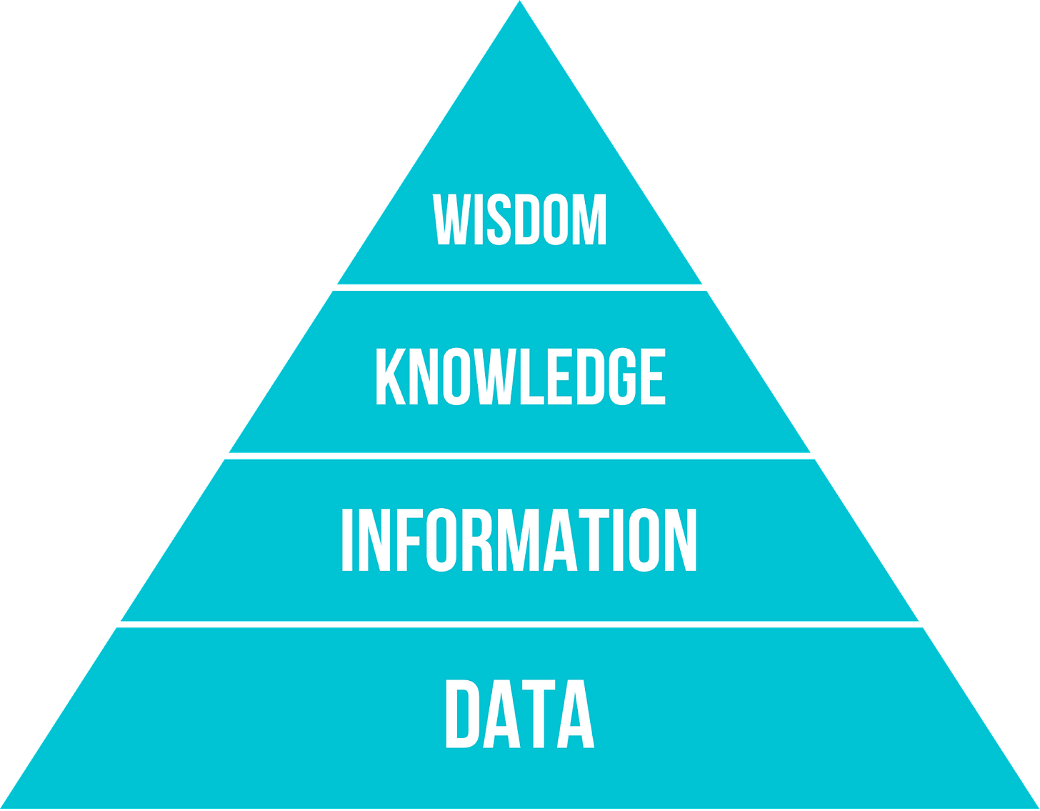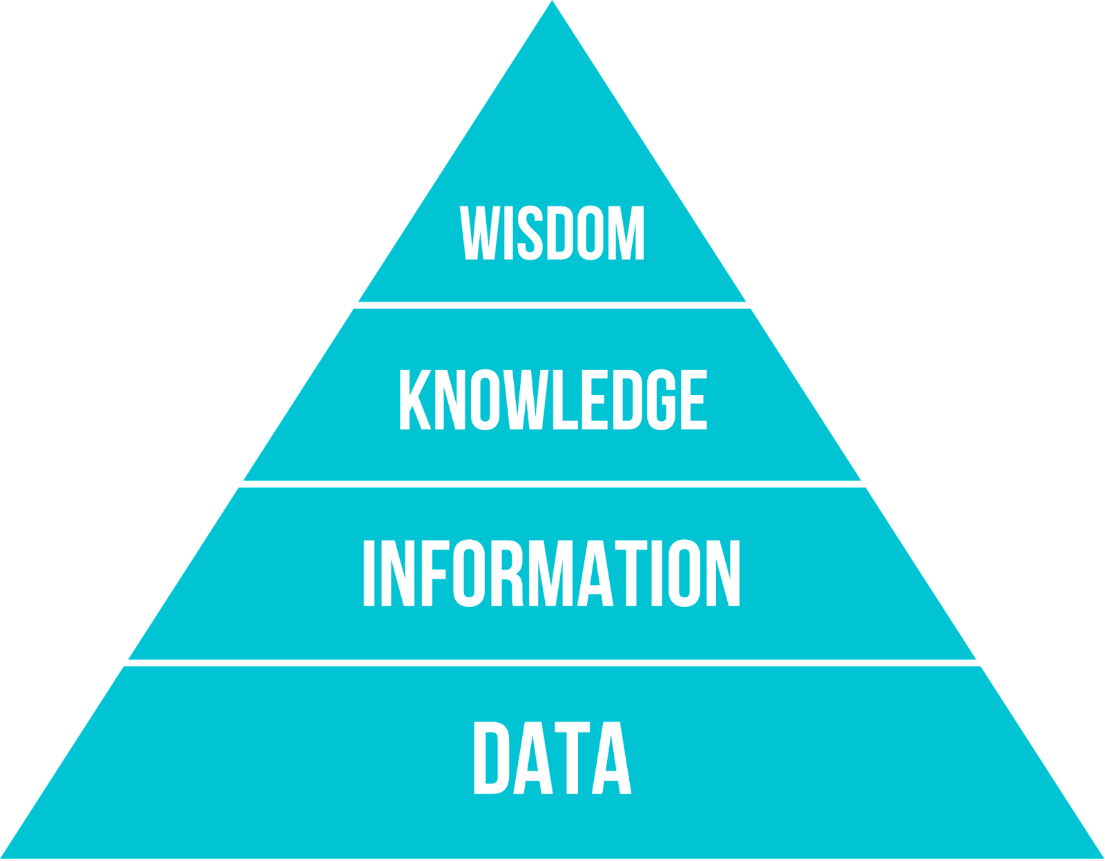 Basitleştirirsek veri, DATA ⇒ INFORMATION ⇒ KNOWLEDGE ⇒ WISDOM6 hiyerarşisi ile dönüşür. Genellikle bu dönüşüm zeminde data’nın olduğu bir piramit ile gösterilir. Alt basamaktan yukarı doğru çıkıldıkça bilgi miktarı doğal olarak azalır. Diğer yandan bilginin niteliği ve yararı artar ve nihai olarak bilgeliğe dönüşür.