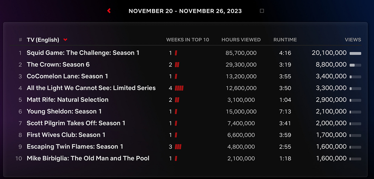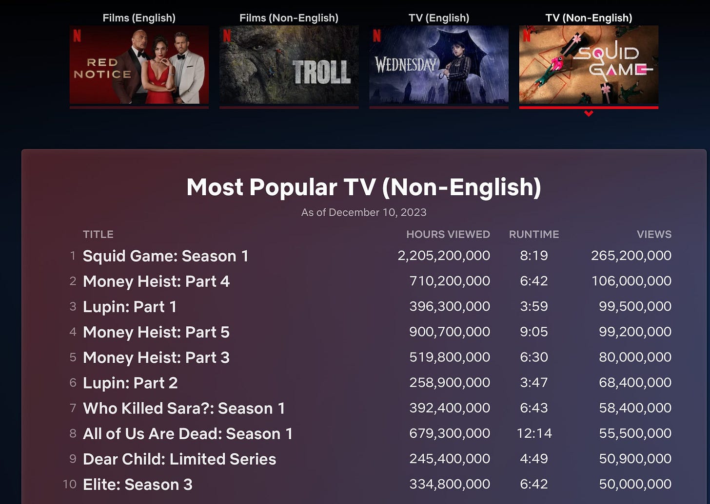 Yukarıdaki listeden Squid Game’e bakalım. 2 milyar saati geçmiş. Geçen ay yayına giren “Squid Game: The Challenge: Season 1” sadece ilk haftasında 20 milyondan fazla izlenmiş ve 80 milyon saati geçmiş. Yani?