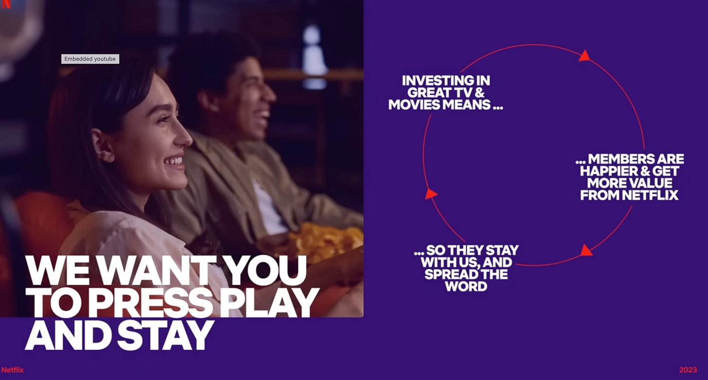 Yukarıdaki slayt Netflix’in engagement’a bakış açısı. Bir şey seçtiğiniz de kalkmadan onu izlemeniz ve yarım bırakmamanız en önemli metrik. Yapılan prodüksiyon yatırımının başarısını belirleyen şey ekran başında geçirilen süre. Diğer streaming platformları rakip ancak dikkatinizi çalan, ekran başı sürenizi azaltan diğer her şey de Netflix için rakip.