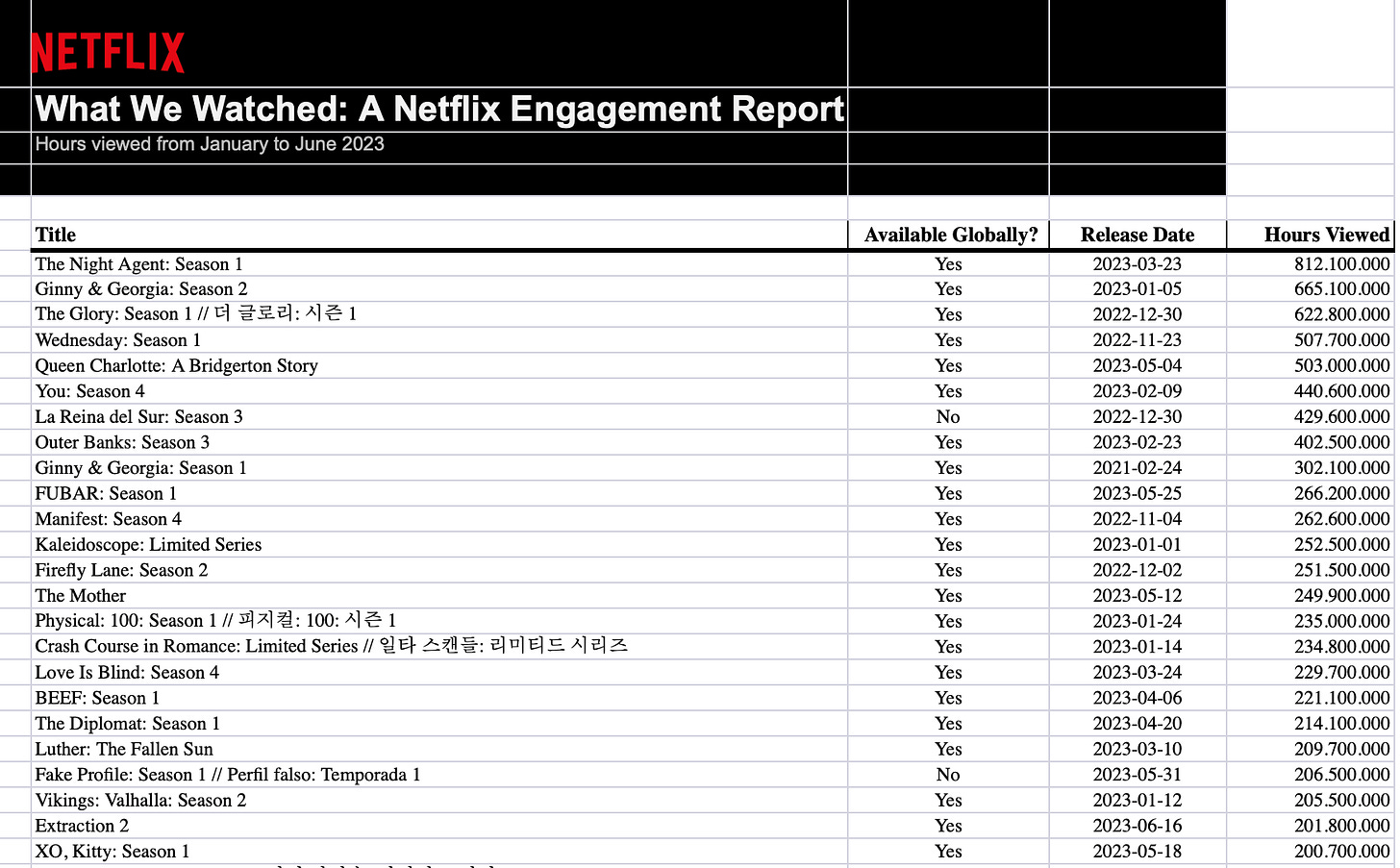 Netflix başta olmak üzere tüm streaming servisleri, kullanıcı verileri açısından bir kapalı kutu. Sadece kendi istedikleri verileri paylaşıyorlar ve halka açık çok az veri var. Netflix içerik üreticileri için 2021 yılından beri en çok izlenen yapımları gösterdiği bir Top 10 listesi yayınlıyordu. 12 Aralık 2023’te, sektör açısından daha fazla iç görü çıkartabilecekleri “What we Watched” raporunu yayınlamaya başladığını duyurdu. Rapor, Ocak-Haziran 2023 arası yayında olan 50.000 saatten daha fazla izleme almış tüm içeriklerin toplan izlenme sürelerini kapsıyor. Netflix’in toplam içeriğinin %99’unu kapsayan raporun toplam izlemesi 100 milyar saatten daha fazla. Ben listenin zirvesini ekran görüntüsü olarak sizlerle paylaşmak istedim. 200 milyon saatten fazla izlenen yapımlar hemen aşağıda.