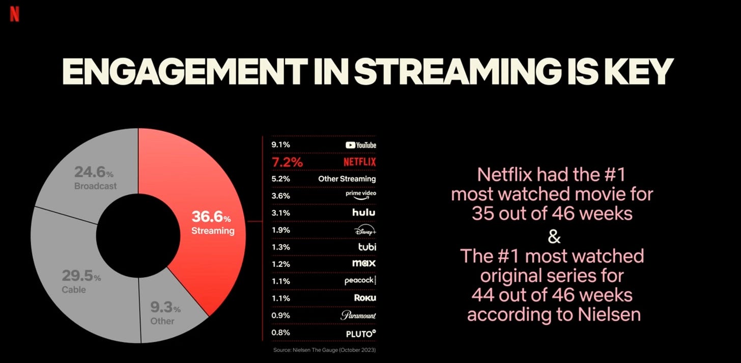 Aşağıda Nielsen verisinde (ABD) streaming hizmetlerinin kablo ve broadcasti açık ara geçtiği artık ana kanal olduğu görülmekte. Netflix kabaca önde gelen rakiplerinin toplamı kadar. 46 haftalık veri içerisinde 35 hafta en çok izlenen film, yine aynı süre içerisinde 44 hafta en çok izlenen dizi Netflix’e ait. Açık ara bir başarı var görünen.