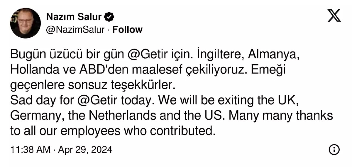 Pandemi sonrası yavaşlayan ekonomiler, azalan yatırım iştahı, gelecek ile ilgili belirsizlik tüm dünyada teknoloji şirketlerini finansal açıdan zorlamaya başlamıştı. Son zamanlarda Getir ile ilgili haberler, işten çıkarmalar işlerin beklendiği gibi gitmediğini gösterir nitelikte idi. Geçen hafta attığı bir tweet ile yurt dışında İngiltere, Almanya, Hollanda ve ABD’den çekilme kararlarını açıkladı.